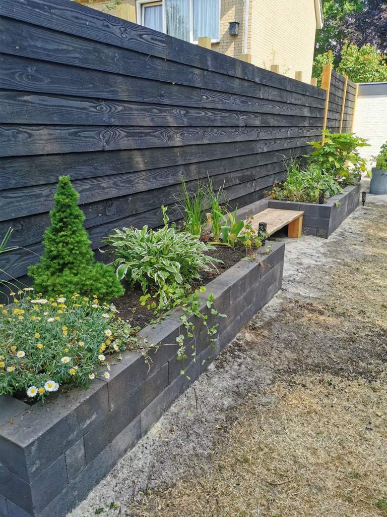 een mooi voorbeeld van het gebruik van natuurlijke materialen. Hoogwaardig hout voor de schutting en het zitgedeelte, linneablokken voor het creëren van borders die ruimte bieden aan gevarieerde bijen en insectenvriendelijke planten. Daarnaast is deze opbouw door de hoogte van de borders en de plantdichtheid zeer onderhoudsvriendelijk!