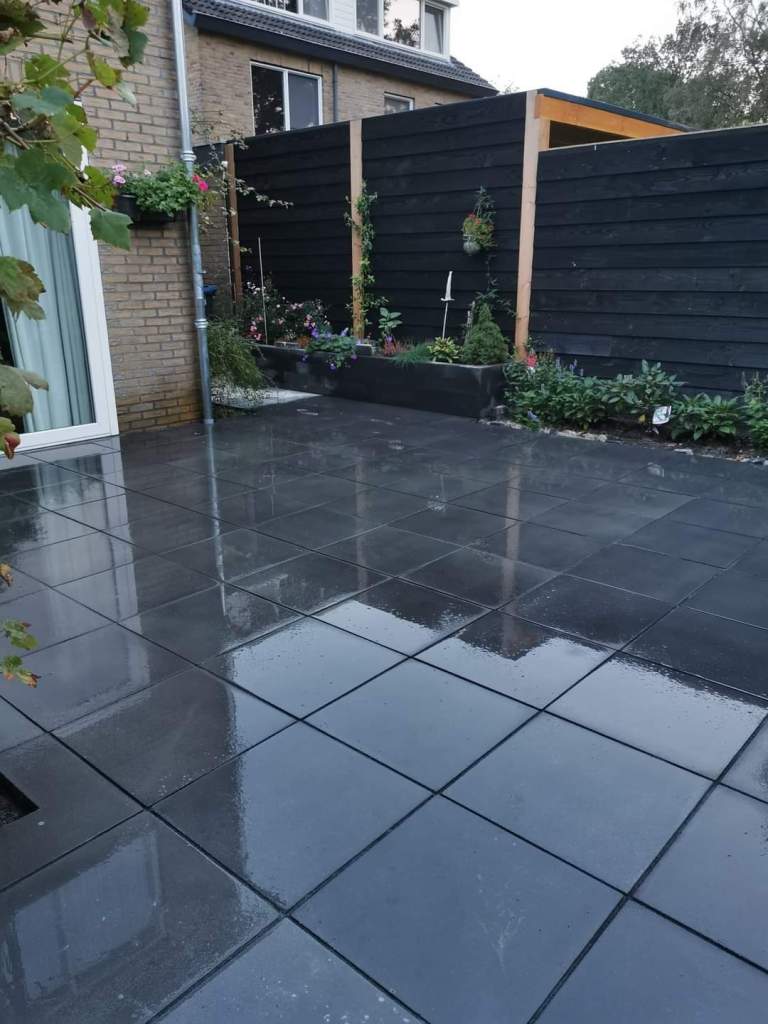 combinatie van terras en beplanting, door de verschillende hoogtes van planten en borders ontstaat een aantrekkelijke en onderhoudsvriendelijke tuin met een moderne bijenvriendelijke uitstraling.