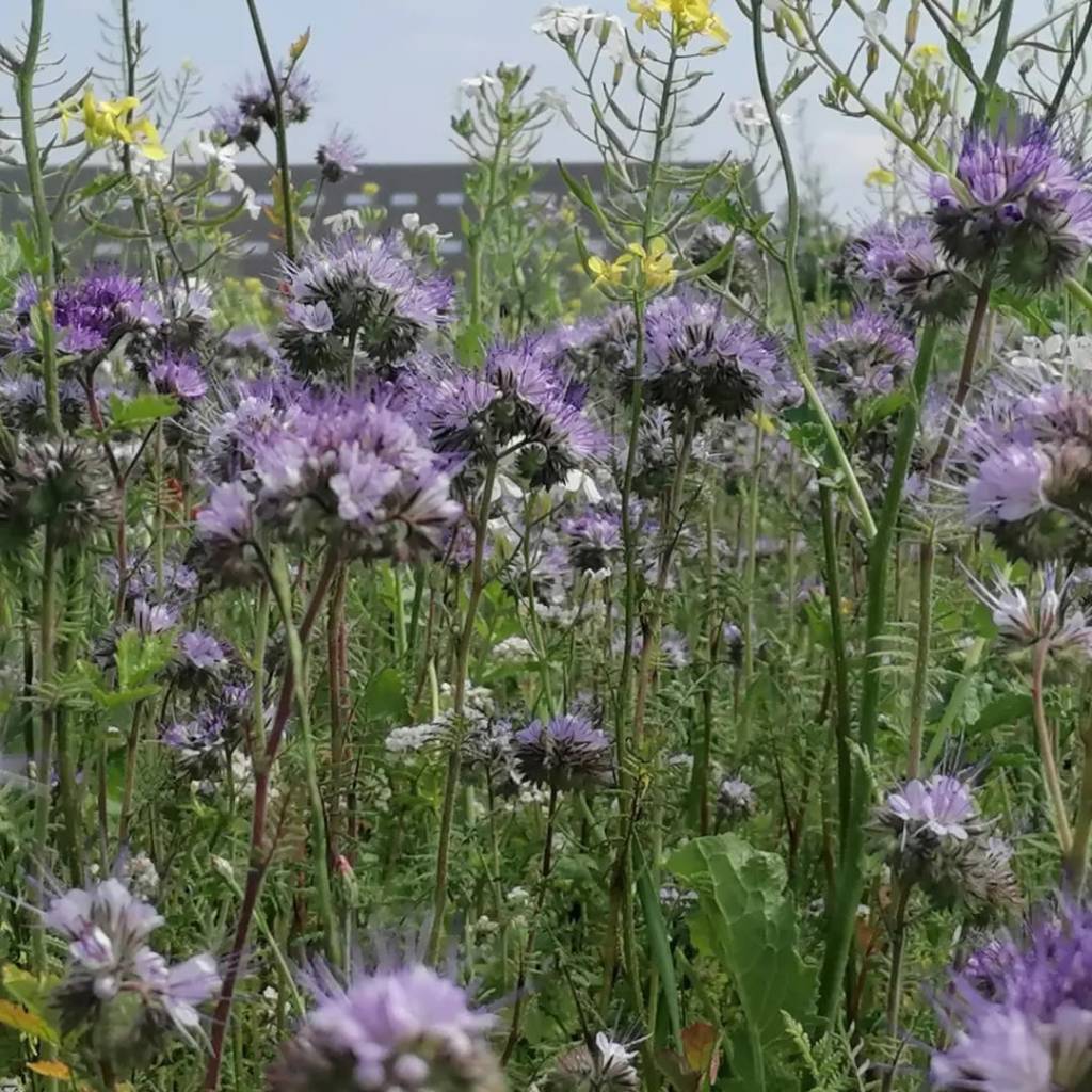 hoewel geen boom of struik, behoort het opnieuw inzaaien van bestaand groeneveld ook tot de mogelijkheden! Zie hier een mooi voorbeeld, ingezaaid met facelia, koolzaad, pioenroos en een rijke variatie aan eenjarige en meerjarige bloemen.