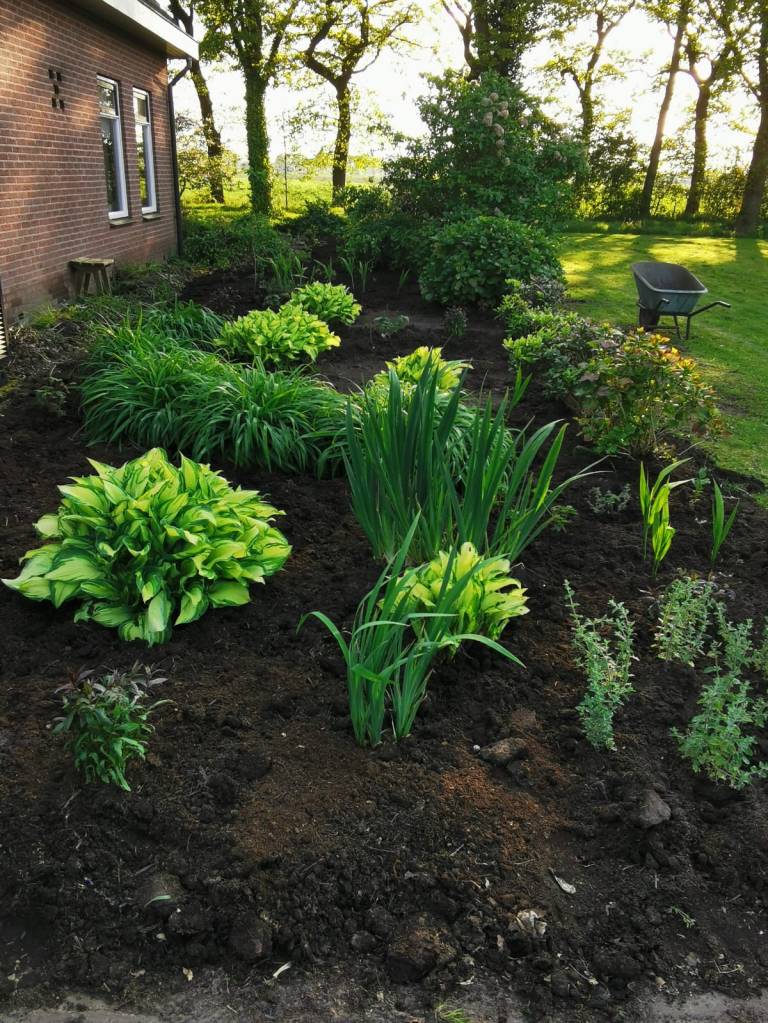 een mooi voorbeeld van het combineren van hoge bomen, en lagere struiken. Momenteel groen en straks in het seizoen een gevarieerd kleurenpallet, aantrekkelijk voor het oog en voor insecten!